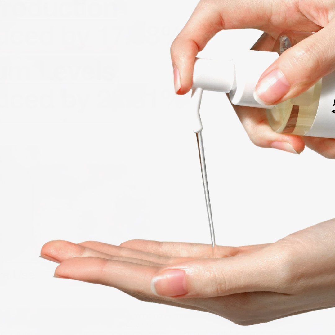 Nałóż 2–3 pompki olejku na suchą skórę twarzy i delikatnie wmasuj. Następnie dodaj odrobinę wody i kontynuuj masaż. Dokładnie spłucz kosmetyk letnią wodą.